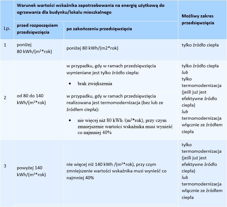 Możliwy do realizacji w ramach Programu zakres przedsięwzięcia uzależniony jest od standardu energetycznego budynku (wskaźnika zapotrzebowania na energię użytkową do ogrzewania) przed rozpoczęciem prac. Wprowadzony został również minimalny wymóg, który musi posiadać budynek po zakończeniu prac: